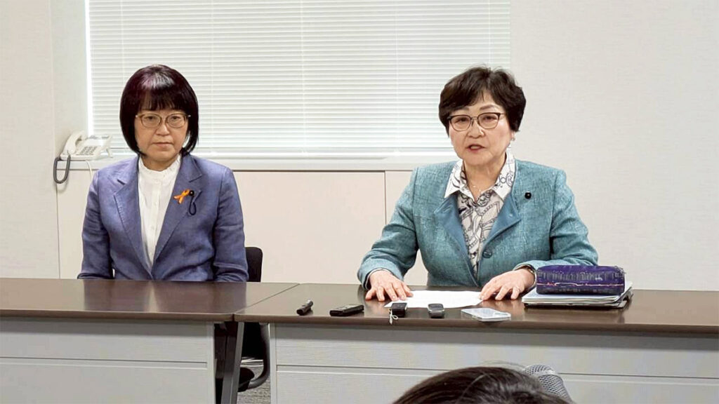 原発再稼働めぐり不適切発言! 2025年12月2日 事が起こったのは定例会初日。注目の泊原発再稼働を知事は〝総合的に判断〟と答弁したのに、職員にメモを入れられ降段間際に〝最終的に判断〟と訂正。真下紀子議員がすかさず議事進行をかけ理由の説明を求めたところ、暫時休会に。 ヤジが飛び交う議場。混乱の中議員席から「今こそ緊急銃猟を」と。言論封殺の、あまりに不穏当な発言であり、日本共産党道義団は謝罪と撤回を求め議長に申し入れ記者会見を行いました。 記者会見する(左から)丸山、真下両道議
